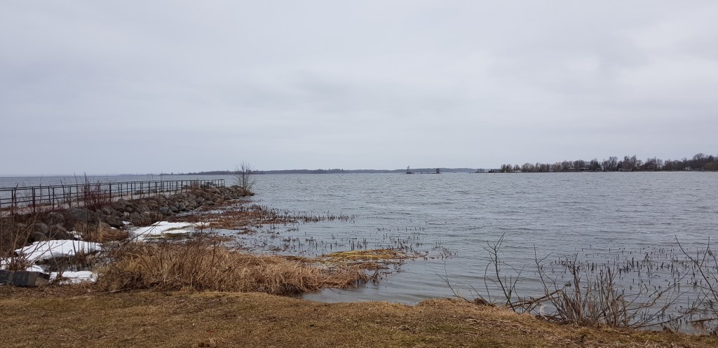 Au bout de 45 minutes de marche, fin de ma route, une jetée barrée d’un ruban de plastique jaune avance sur une étendue grise et peu inspirante… Entre deux langues de terre le regard se perd, puis sombre, dans un horizon gris indistinct… »